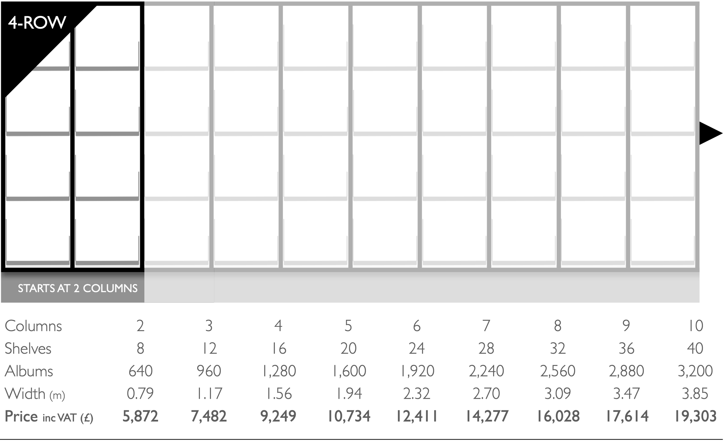 Chorus Walls and Islands can be two to five rows high and you can have as many columns as your LP collection needs, subject to a minimum number of columns (and your space, of course!).